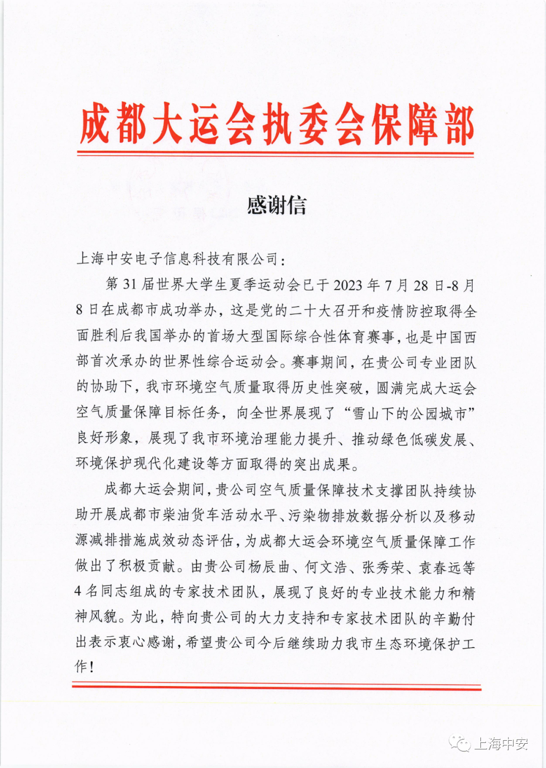 中安科技圓滿完成第31屆世界大學(xué)生夏季運動會空氣質(zhì)量保障任務(wù)!(2023-10-9)
